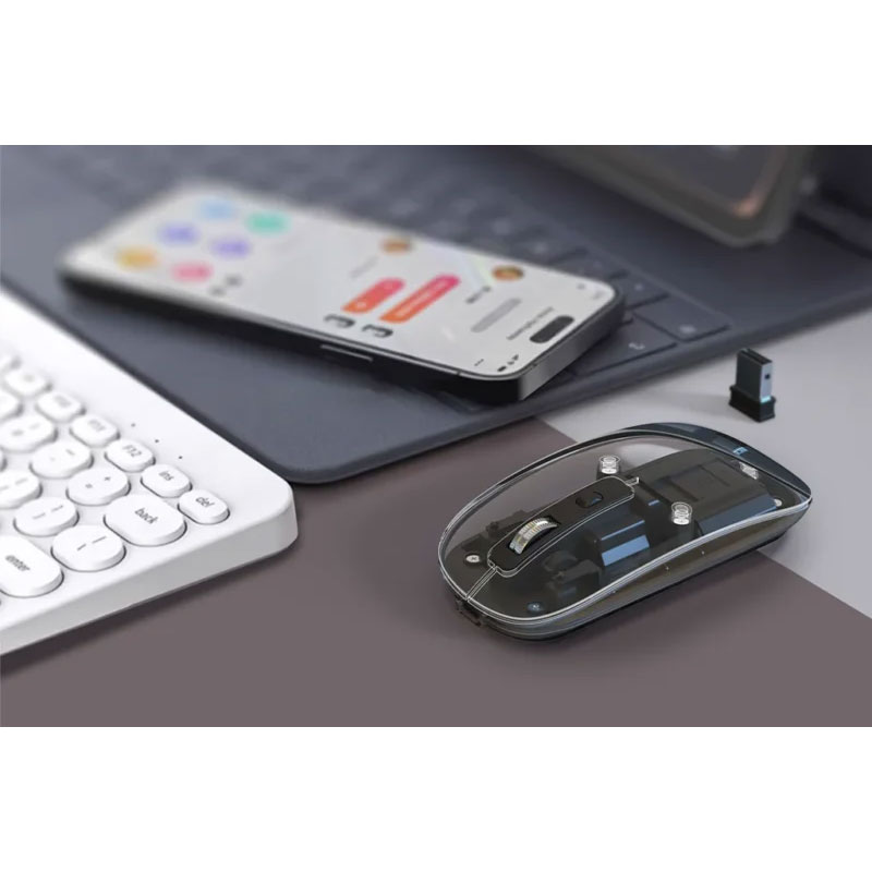 Elegantna in vsestranska brezžična miška, zasnovana za delo in prosti čas. Združuje sodoben dizajn, prilagodljive funkcije in enostavno uporabo, zato je primerna za vsakodnevno uporabo doma, v pisarni ali na poti. Omogoča dva načina povezave (2.4G brezžično in Bluetooth), kar zagotavlja stabilno in prilagodljivo povezljivost z različnimi napravami. Z nastavljivo občutljivostjo do 1600 DPI lahko enostavno prilagodite natančnost glede na opravila od natančnega dela do hitrega brskanja. Poseben vizualni poudarek predstavlja 7-barvna RGB osvetlitev, ki poskrbi za bolj osebno in dinamično uporabniško izkušnjo. Vgrajena polnilna baterija omogoča dolgotrajno uporabo, lahka in kompaktna zasnova pa poskrbi za enostavno prenašanje.