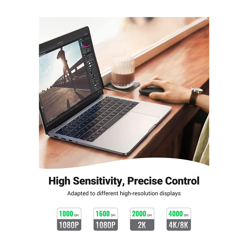 Brezžična miška Ugreen Sielent z minimalističnim dizajnom je majhna in kompaktna ter udobna za dolgotrajno uporabo. Miška ima odličen optični senzor, ki omogoča delo na večini površin. Miško odlikujejo tihi gumbi brez motenj in nadzornimi nastavitvami do 4.000 DPI. Zahvaljujoč tehnologiji brezžični povezavi 2,4 GHz se lahko miška brez težav seznani. S svojimi obnovitvenimi gibi, pri hitrem delovanju, je kot nalašč za zaslone 4K/8K.