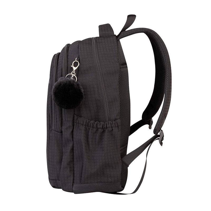 Nahrbtnik je zasnovan za vsakodnevno uporabo, kjer se prepletata praktičnost in moderen videz. S premišljeno razporeditvijo prostora omogoča enostavno organizacijo vseh potrebščin, hkrati pa zagotavlja udobje pri nošenju skozi ves dan. Notranjost vključuje organizator, ki poskrbi za urejeno shranjevanje manjših predmetov, ter poseben žep za prenosni računalnik, ki nudi dodatno zaščito in varno prenašanje. Za dodatno funkcionalnost je na voljo tudi stranski žep za stekleničko, ki omogoča hiter dostop do pijače. Udobje pri nošenju zagotavljajo oblazinjene in nastavljive naramnice, ki se prilagodijo uporabniku, ter rahlo oblazinjeno hrbtišče, ki nudi dodatno podporo. Poseben estetski poudarek daje obesek za ključe v obliki cofka (»pom pom«), ki nahrbtniku doda igriv in trendovski pridih.