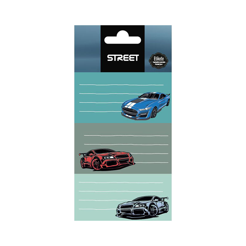 Nalepke za zvezke Street Cars z različnimi motivi.