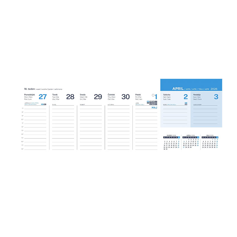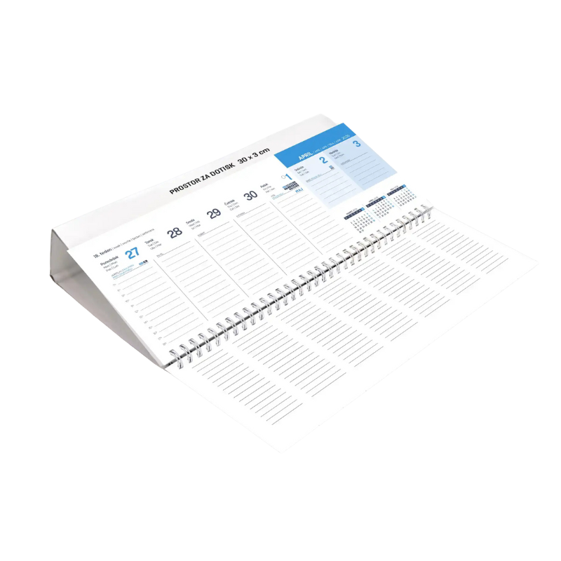 Ležeči namizni koledar je primeren za planiranje sestankov, obletnic, poslovnih in osebnih opravil. Koledarski del ima označene slovenske in tuje praznike, imena, lune in tedne. Podatki so navedeni v petih jezikih (SLO, ANG, NEM, ITA, HR).