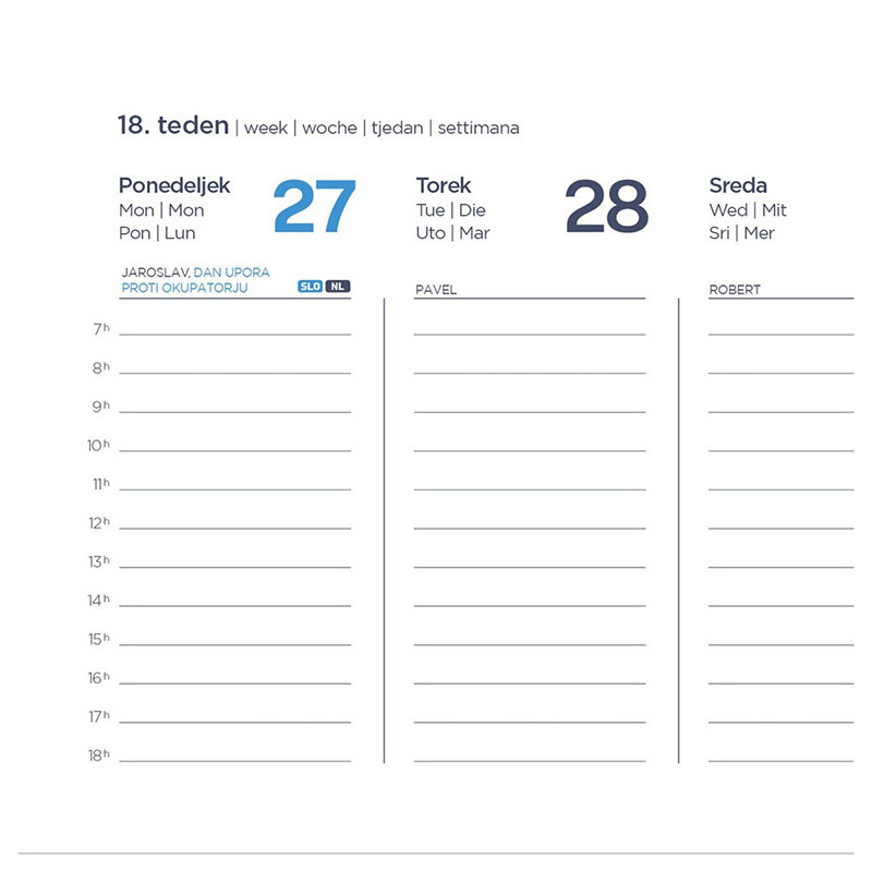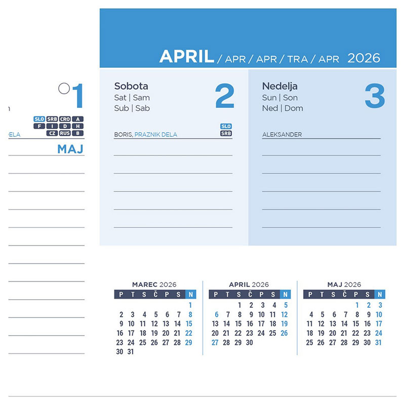 Pokončni namizni koledar je primeren za planiranje sestankov, obletnic, poslovnih in osebnih opravil. Koledarski del ima označene slovenske in tuje praznike, imena, lune in tedne. Podatki so navedeni v petih jezikih (SLO, ANG, NEM, ITA, HR).