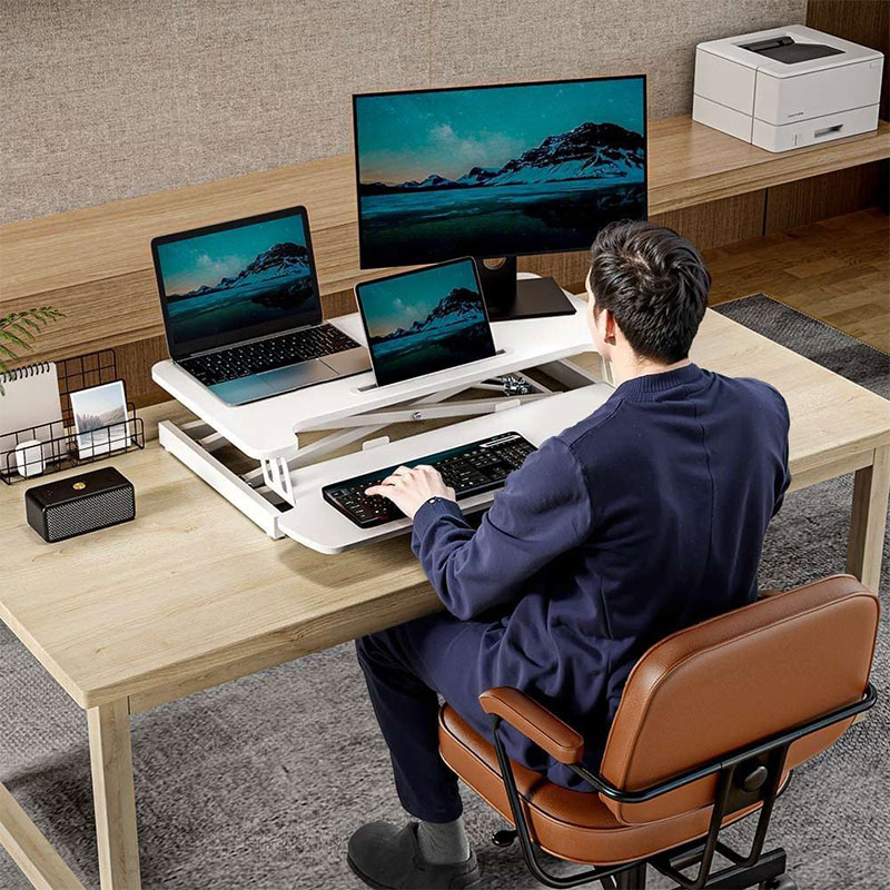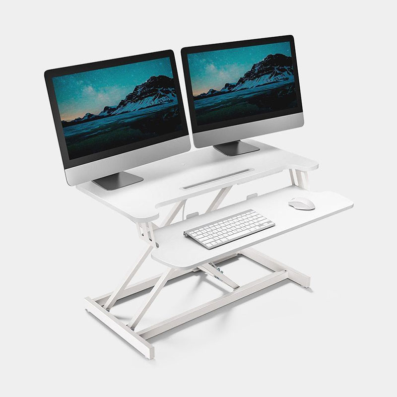 Izdelan je z močno jekleno X-konstrukcijo in nedrsečimi gumijastimi nogicami, kar zagotavlja popolno stabilnost in varno namestitev vaše opreme. Nosilnost delovne površine do 15 kg podpira vašo pisarniško postavitev, enostaven ročaj in gladka plinska vzmet pa omogočata hitro in preprosto nastavitev idealne višine. Kakovostna iverna plošča s PVC laminirano površino ponuja dovolj prostora za monitor, prenosnik in pisarniške pripomočke. Vgrajena odprtina za kable omogoča enostavno namestitev nosilca za monitor, s čimer si ustvarite delovni prostor po meri. Pladenj za tipkovnico in držalo za tablico pa pomagata ohraniti urejeno delovno površino.
