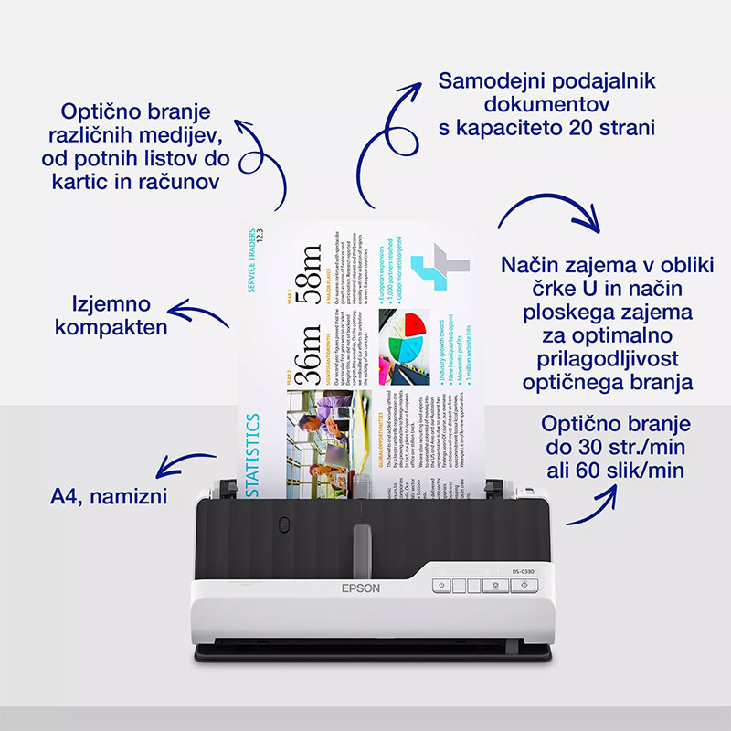 - Hitrost skeniranja do 30 strani/minuto (črno-bela), do 60 strani/minuto (barvna)