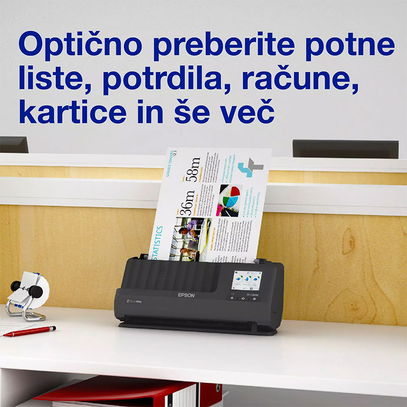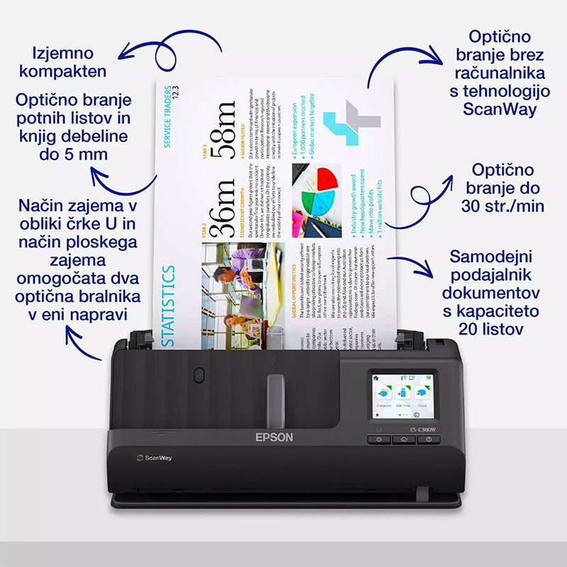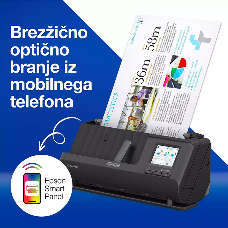 Z barvnim zaslonom na dotik usmerjajte optično prebrane dokumente neposredno na pravi cilj brez povezave z računalnikom. Optično branje neposredno v omrežne mape, e-pošto, pomnilnik USB in priljubljene storitve v oblaku, kot so Google Drive, Dropbox, Evernote in OneDrive za podjetja. Optično branje v Microsoftove aplikacije Word, Excel in PowerPoint. Združljiv z operacijskimi sistemi Windows, Mac, Chromebook, Android Mopria, Apple Airprint in Epsonovo aplikacijo SmartPanel.
