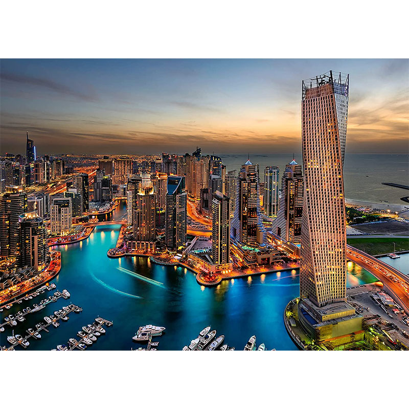 , ki vam prinaša enega najbolj spektakularnih urbanih razgledov sveta – obmorski del futurističnega Dubaja, poln steklenih stolpnic, jaht in žarečega neba. Izdelana je z uporabo