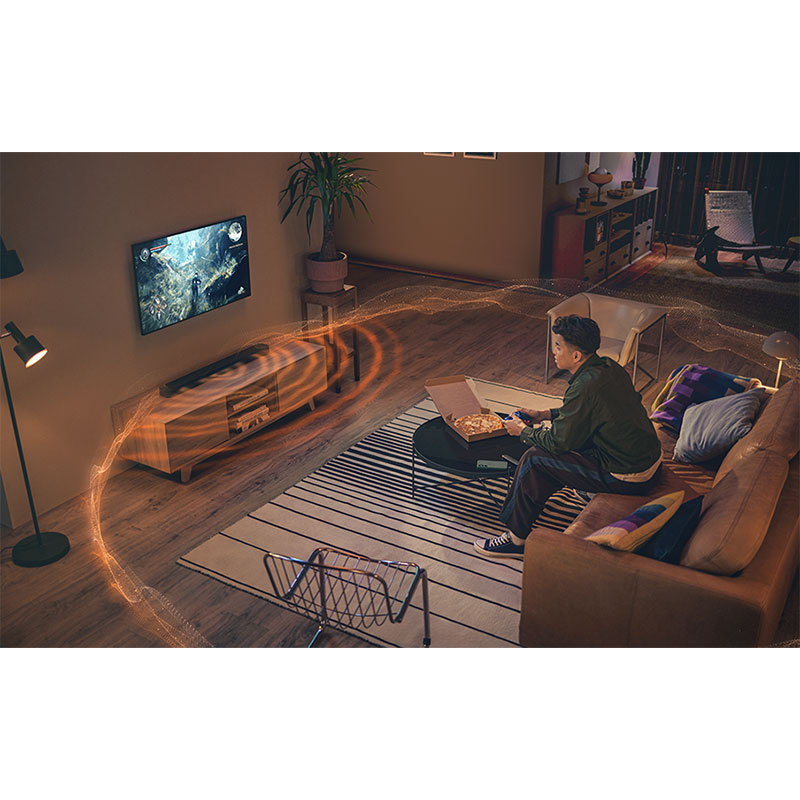 do 450 W omogoča bogat, prostoren in jasen zvok — dialogi so dobro razumljivi, akcijski prizori pa zveneči in polni podrobnosti. Podpira tehnologijo