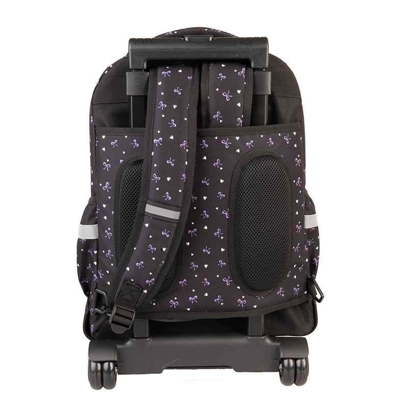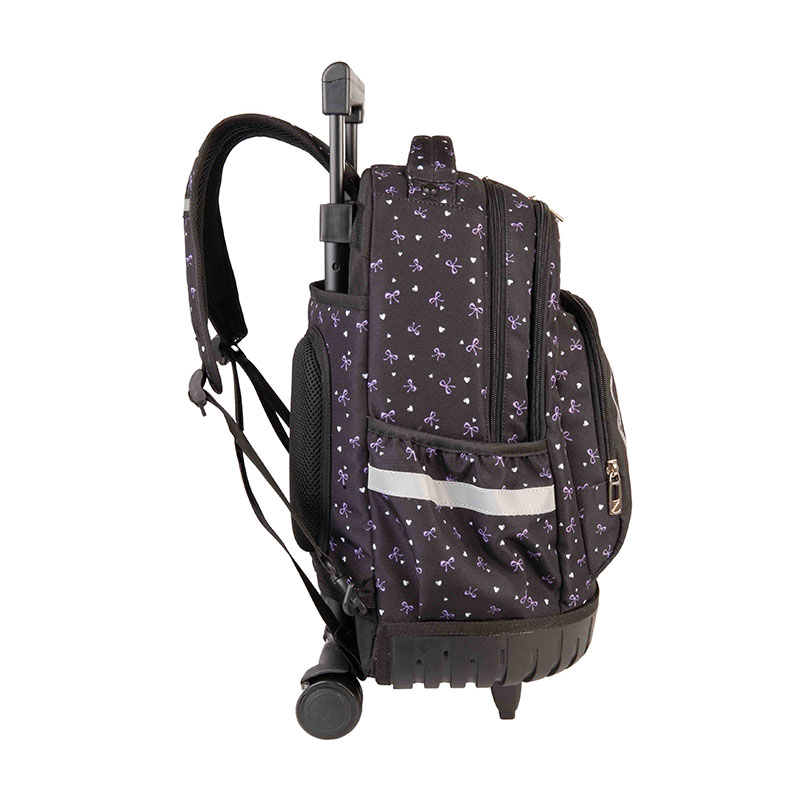 Vzdržljiv, ovalen, šolski nahrbtnik na kolesih, poskrbi za popolno razbremenitev hrbta. Vsebuje nastavljive, funkcionalne in izjemno udobne naramnice, ki omogočajo, da ga nosite ves dan brez neprijetnosti ali bolečin. Vključuje veliko prostorno notranjost, katera bo zagotovila za organizirano prenašanje raznih stvari. Vsebuje tudi številne predelke in žepe, vključno s prostornim sprednjim žepom in stranskimi žepi, ki so idealni za shranjevanje manjših predmetov, kot so ključi, denarnica, mobilni telefon in steklenica vode. Posebna značilnost tega nahrbtnika so kolesa, ki so dodana za lažje rokovanje. Tako ga lahko preprosto potisnete ali povlečete, kadar želite razbremeniti hrbet. Narejen je iz trpežnega poliestra, ki je odporen proti obrabi, kar zagotavlja dolgo življenjsko dobo.