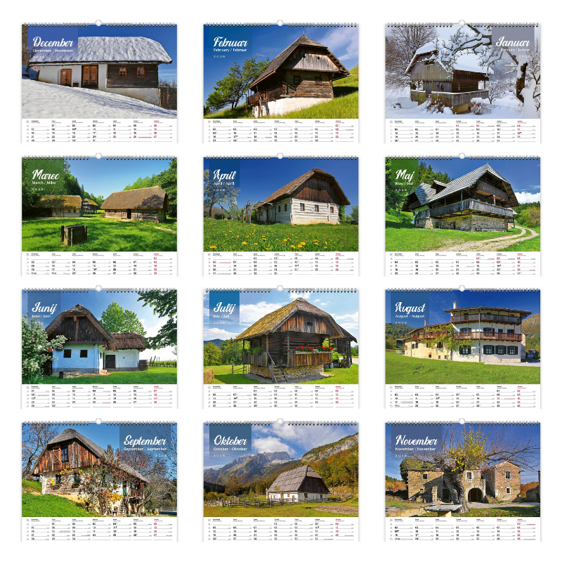 Stenski koledar. Označene ima praznike in lune. Podatki so navedeni v treh jezikih (SLO, ANG, NEM).