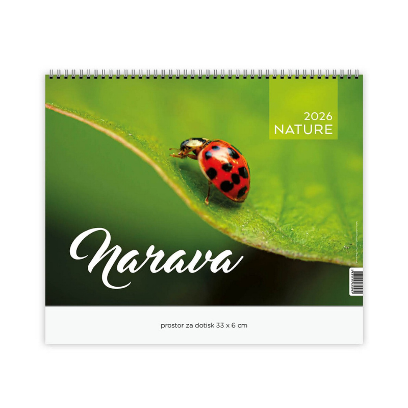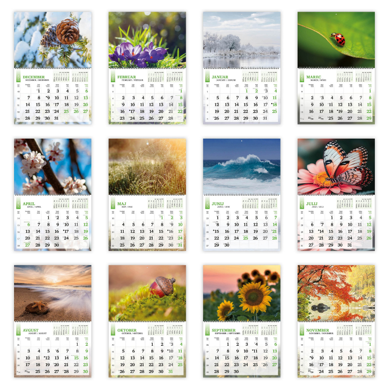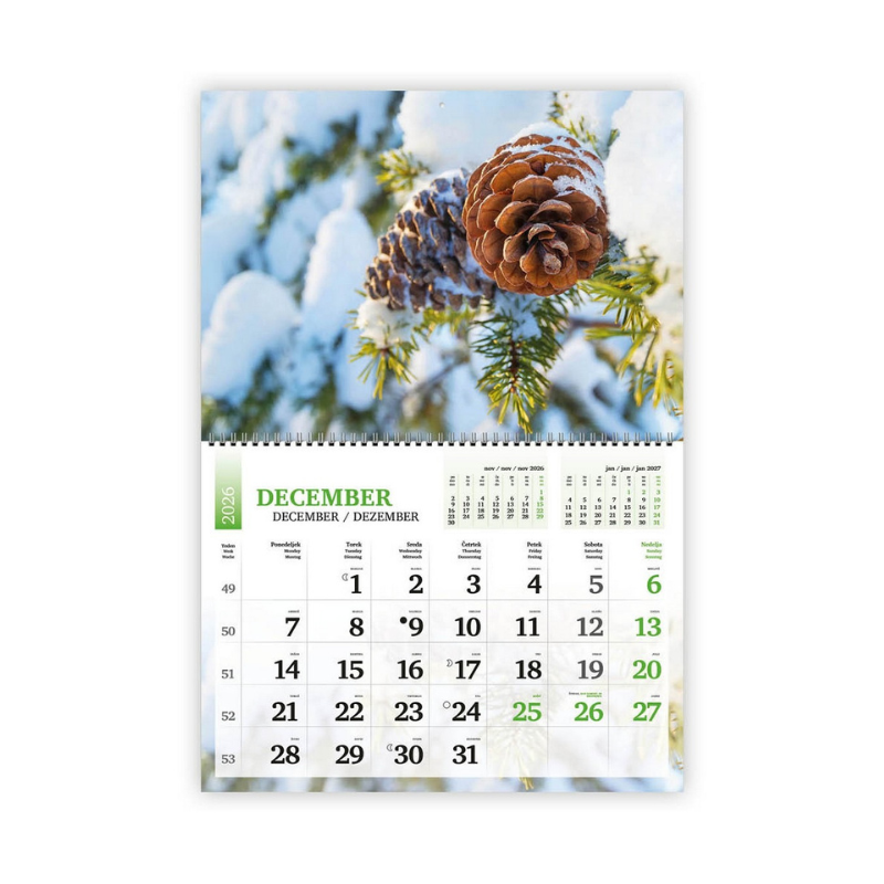 Stenski trimesečni koledar. Označene ima praznike in lune. Podatki so navedeni v treh jezikih (SLO, ANG, NEM).