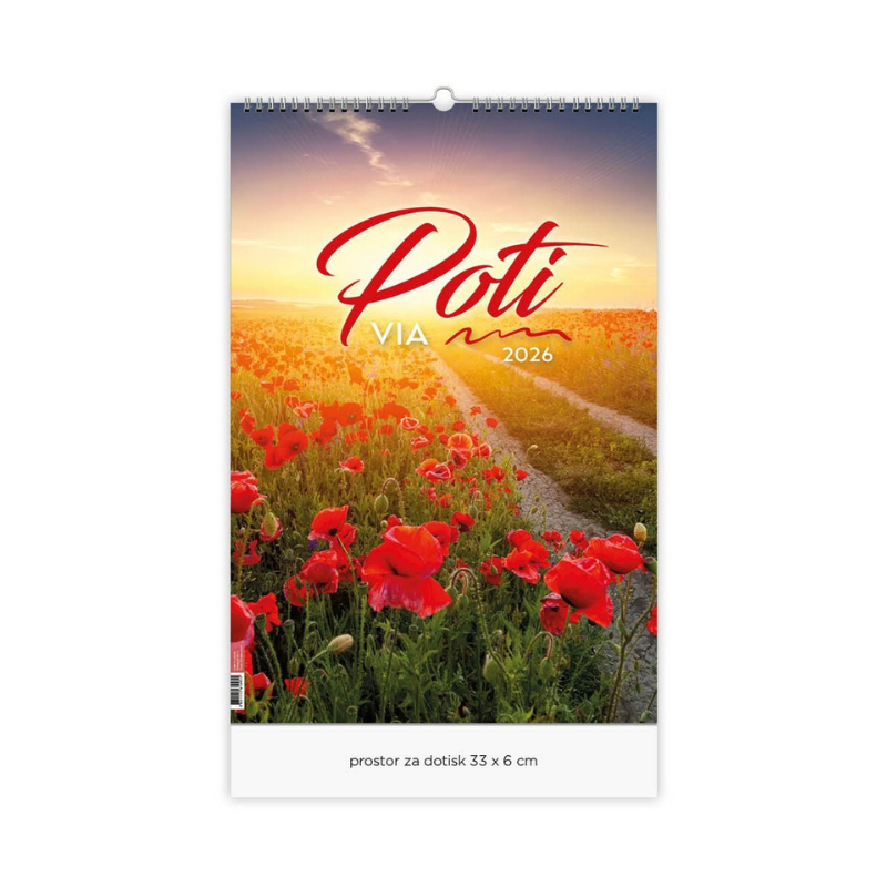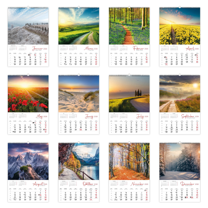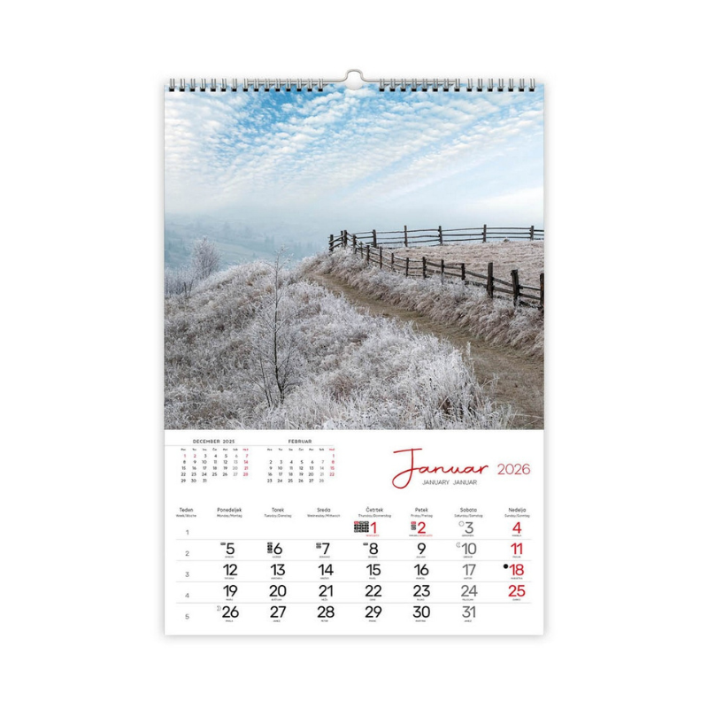Stenski trimesečni koledar. Označene ima praznike in lune. Podatki so navedeni v treh jezikih (SLO, ANG, NEM).