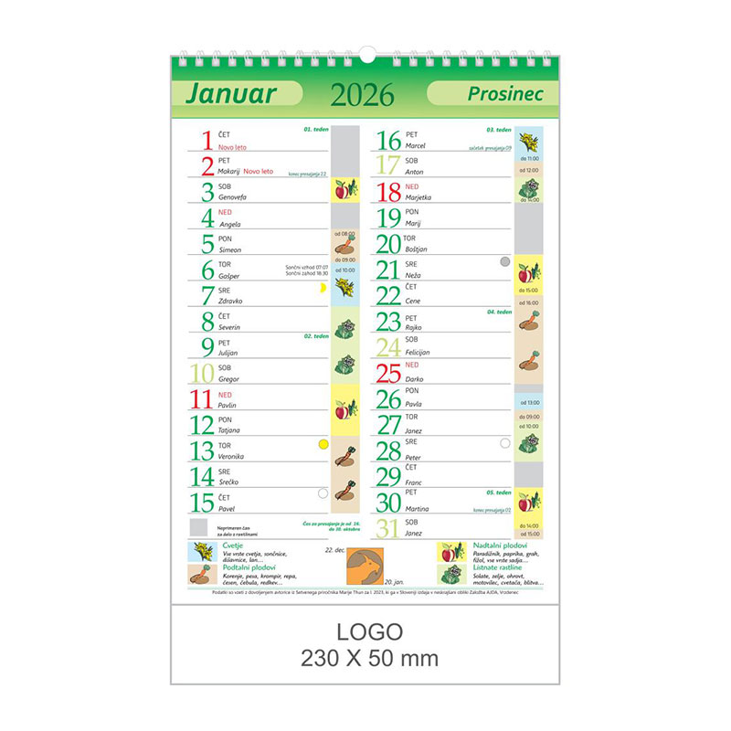 Stenski setveni koledar. Prikazuje število tednov, lune, horoskop in čas sajenja.