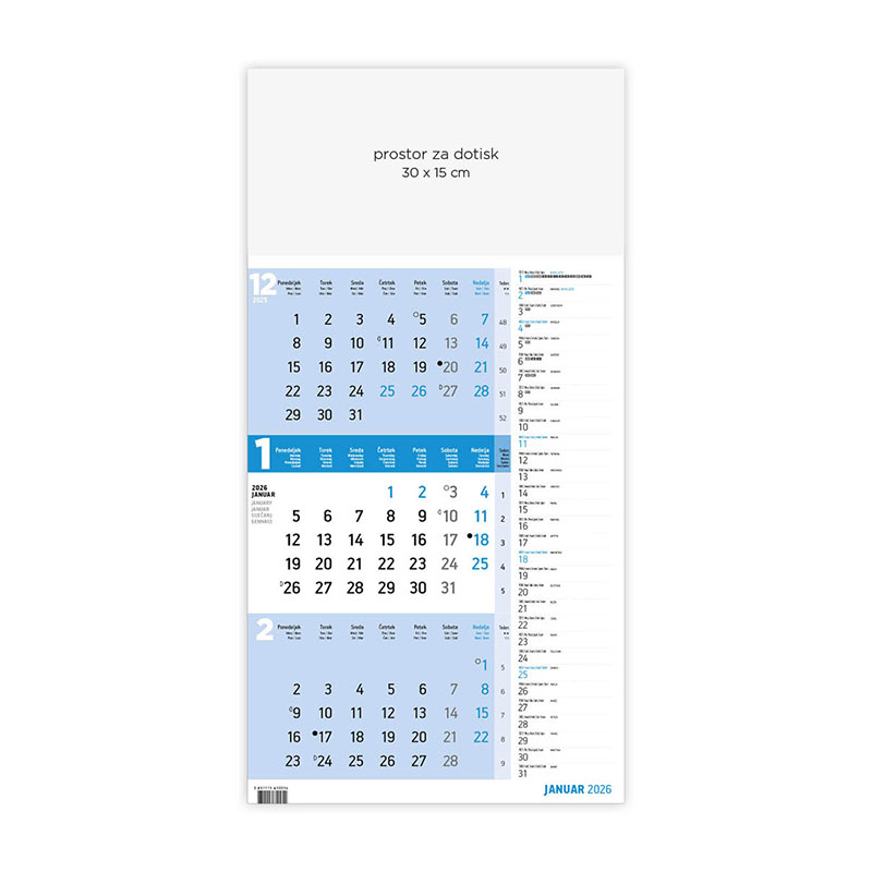 Stenski 3-delni koledar s planerjem, označevalcem dneva in prostorom za logo (30 x 15 cm). Prikazuje slovenske in tuje praznike, lune in tedne. Podatki so navedeni v petih jezikih (SLO, ANG, NEM, ITA, HR).