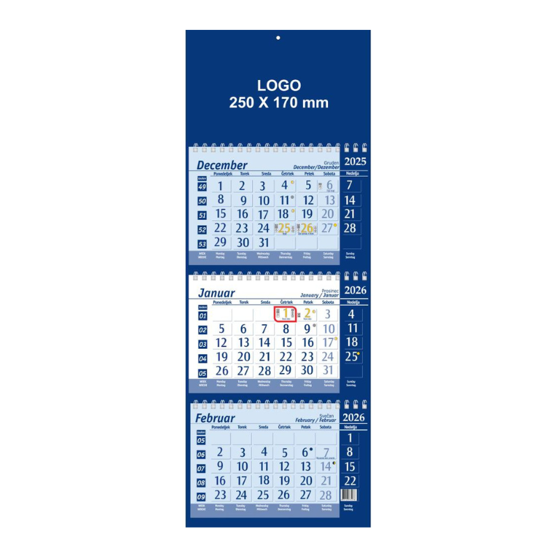 Stenski 3-delni koledar s špiralno vezavo, označevalcem dneva in prostorom za logo (24,5 x 15 cm).
