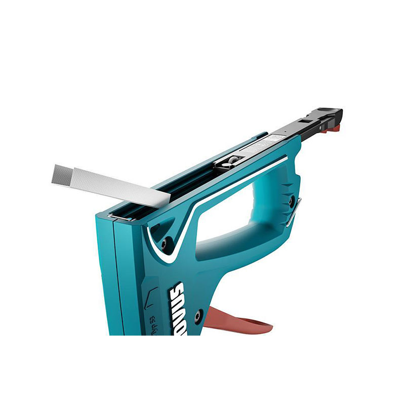 z varnostnim zaklopom omogoča enostavno menjavo ter pregled nad zalogo sponk. Ohišje je izdelano iz ABS plastike. Primeren je za uporabo s sponkami tipa A model 53 (150 kosov), dolžine sponk pa naj bodo od 4 – 8 mm.