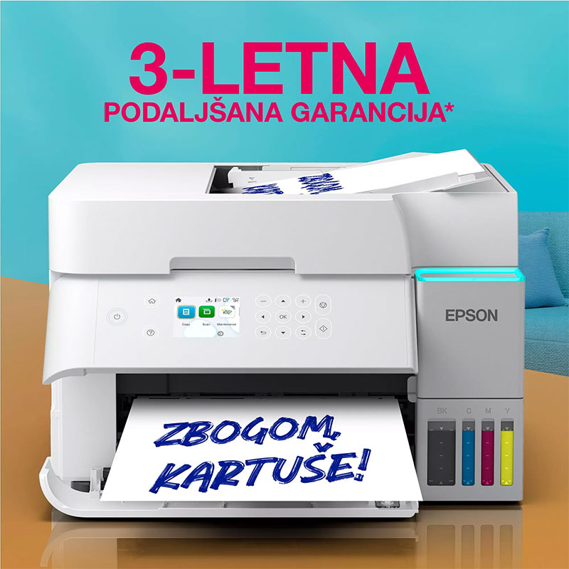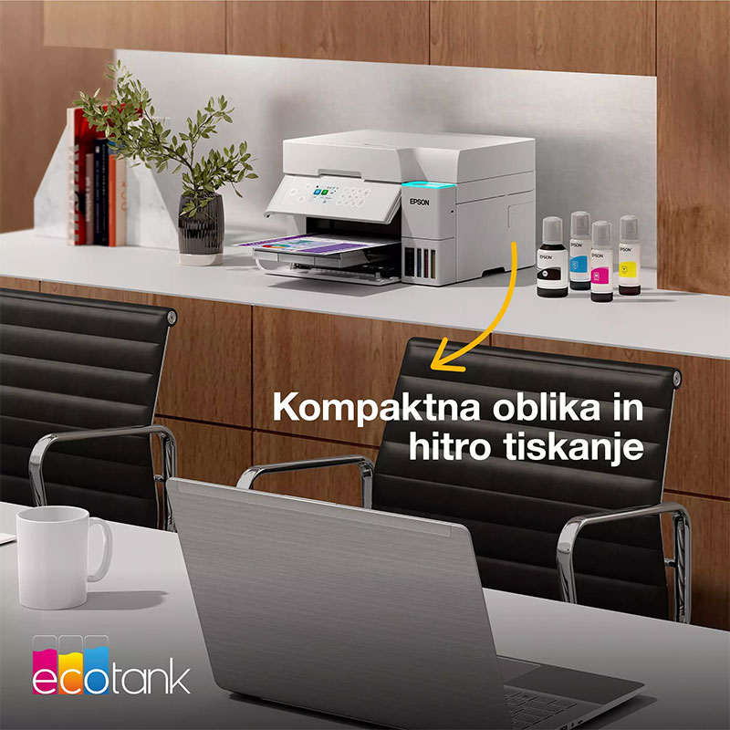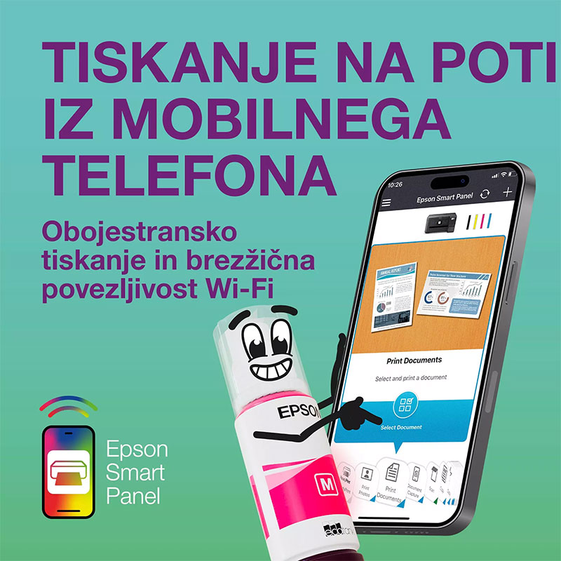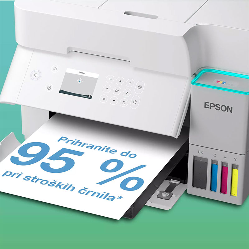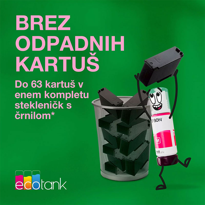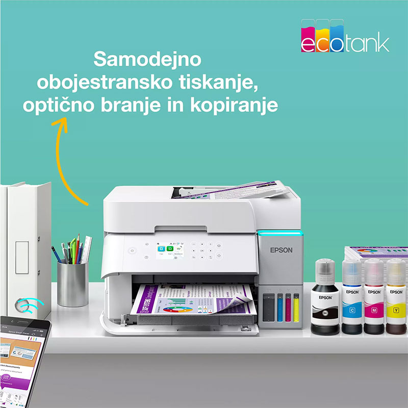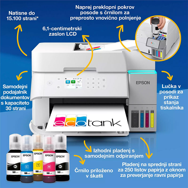 - v paketu črnilo za do triletno uporabo: priloženo črnilo za natis 15.100 črno-belih in 5.500 barvnih strani - izjemno zmogljive nadomestne stekleničke s črnilom: en komplet stekleničk s črnilom je enakovreden do 63 kartušam s črnilom - aplikacija Epson Smart Panel: brezžično nastavite, spremljajte, tiskajte, optično prebirajte in več iz vaše pametne naprave