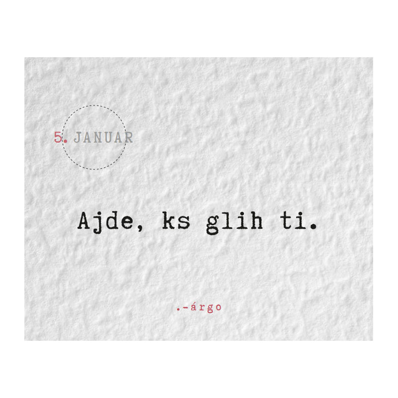 Zdej pa taku ... Če ga maja Štajerci pa Karuošci, ga muoraja mt tud Dalenci. Taku buo pa fertik! Pa smo nirprej Padgurce uprašal, kaku pa kej. Pol sma še Jakata paklical, k je iz Grasupliga pa abvlada scena tam dol da Čušperka pa še naprej. Pol je pa še Klemen iz Stične pršu, on ma tut prjatle pausuod akul. Pa sma ta rejč zrihtal, tlele ja mate. Nejsma usaka vas zavil, jih je rejs dost, sma se pa pamujal najt besejde z več koncu, de je kalendr še pa še bagat. Paše za usak lejt – k ga buo konc, ga samu akul abarni pa spiet griema. Praznke pa use štir dejle lejta sma tud ahtal, taku de use štima, doukcajt ti pa taku al taku ne muore bt – na Dalenskim tiga ne buoš daživu. Če kaj ne zastuopiš, pa uprašaj, buh te nema rat!.